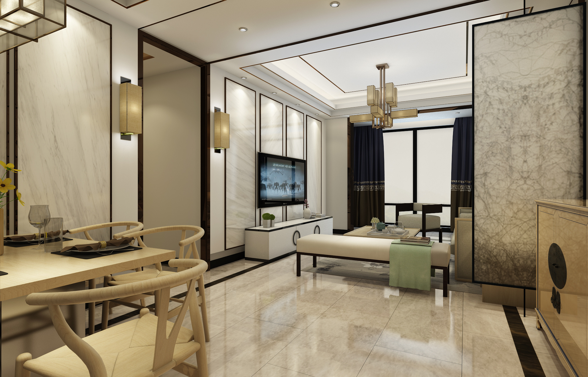 进门透过玄关就是客厅空间,以灰白为主的客厅空间,沙发、茶几、地毯等搭配起来,给人一种简约、大方的感觉。电视背景墙采用了大理石纹的质感,配合着整个空间,是时下非常流行的轻奢风格。